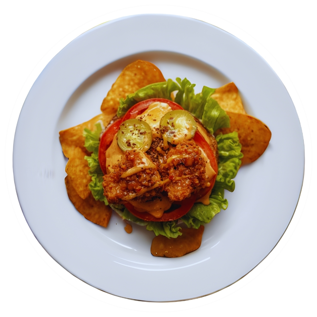 Marul Turşu Domates Burger sosu İki parça tavuk Kaşar peyniri Doritos cipsi.