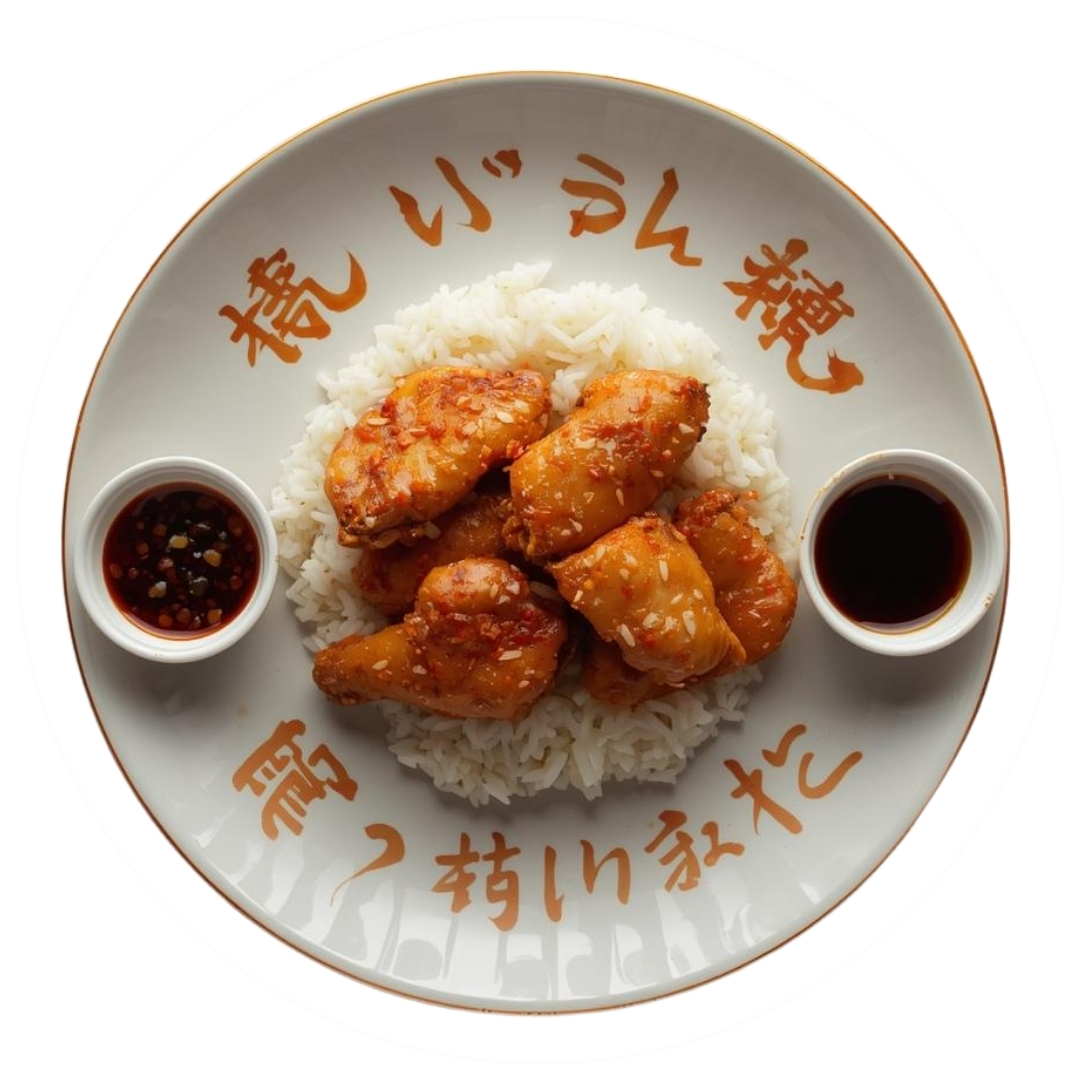 Bol tereyağlı pirinç pilavı üzerine seçmeli özel tokyo soslu tavuk.